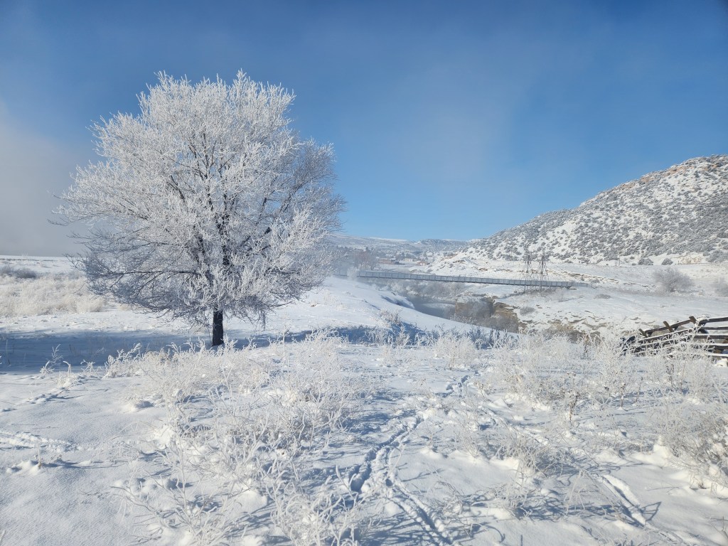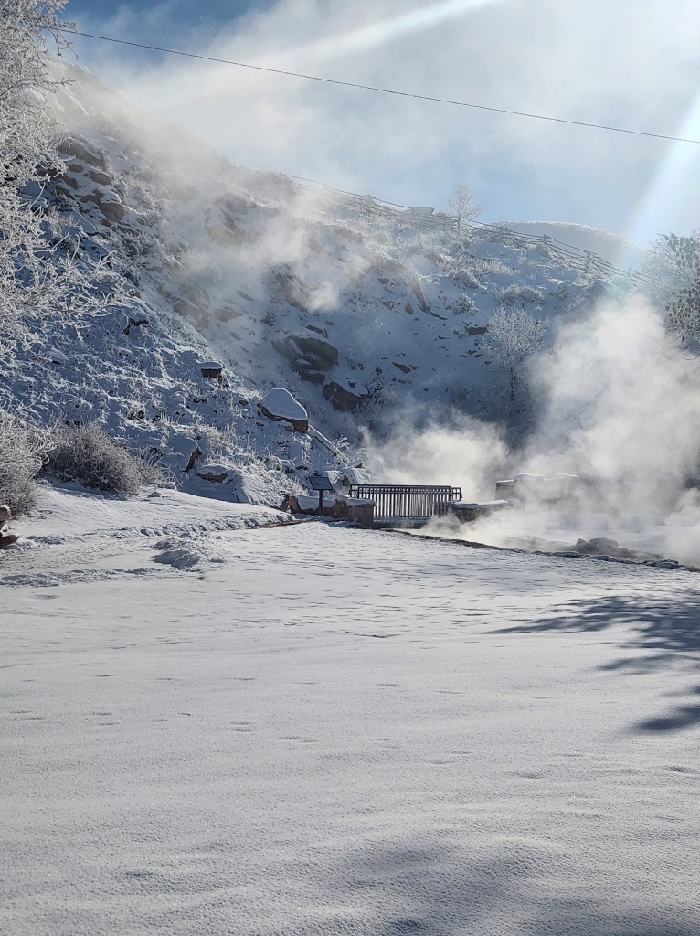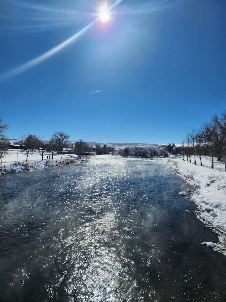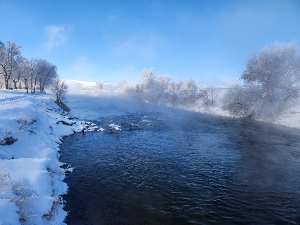 On our way to the pool Saturday morning, steam rose from the river and with the new layer of snow, it lent the landscape a sense of mystery and enchantment. I found the view so astonishing I’d yelled, “Stop.” Kem hit the brakes, fishtailing the car on the icy roads, everyone panicked.