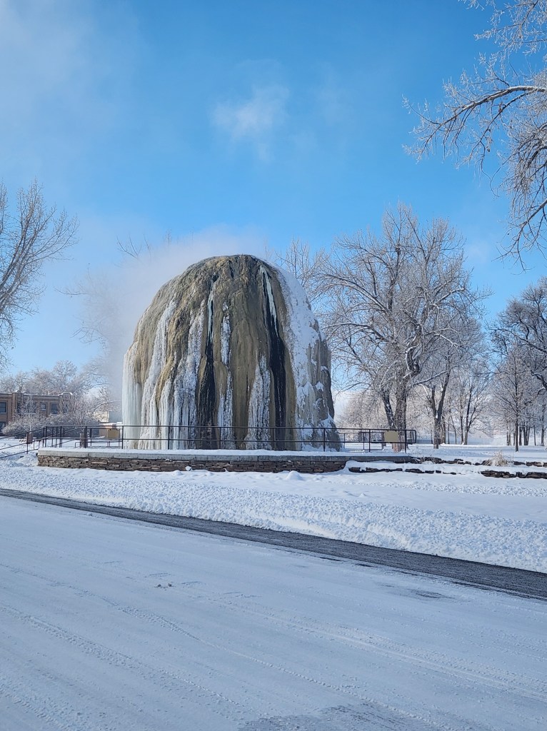 We made our trip this year over President’s Day weekend, and because this unseasonably warm winter likes to remain enigmatic, a freak cold snap offered sub-zero mornings, probably the coldest weather we’ve ever had on a Thermopolis trip. In the outside pools, our hair frosted over, and, as two young women walked by in bikinis and stocking caps topped with fuzzy balls, I heard several people murmur, “They’ve got the right idea.” There was so much steam on the outside pools that I circled the entire pool looking for my girls, and when I finally found them, realized they’d only been a few yards ahead of me the entire time.