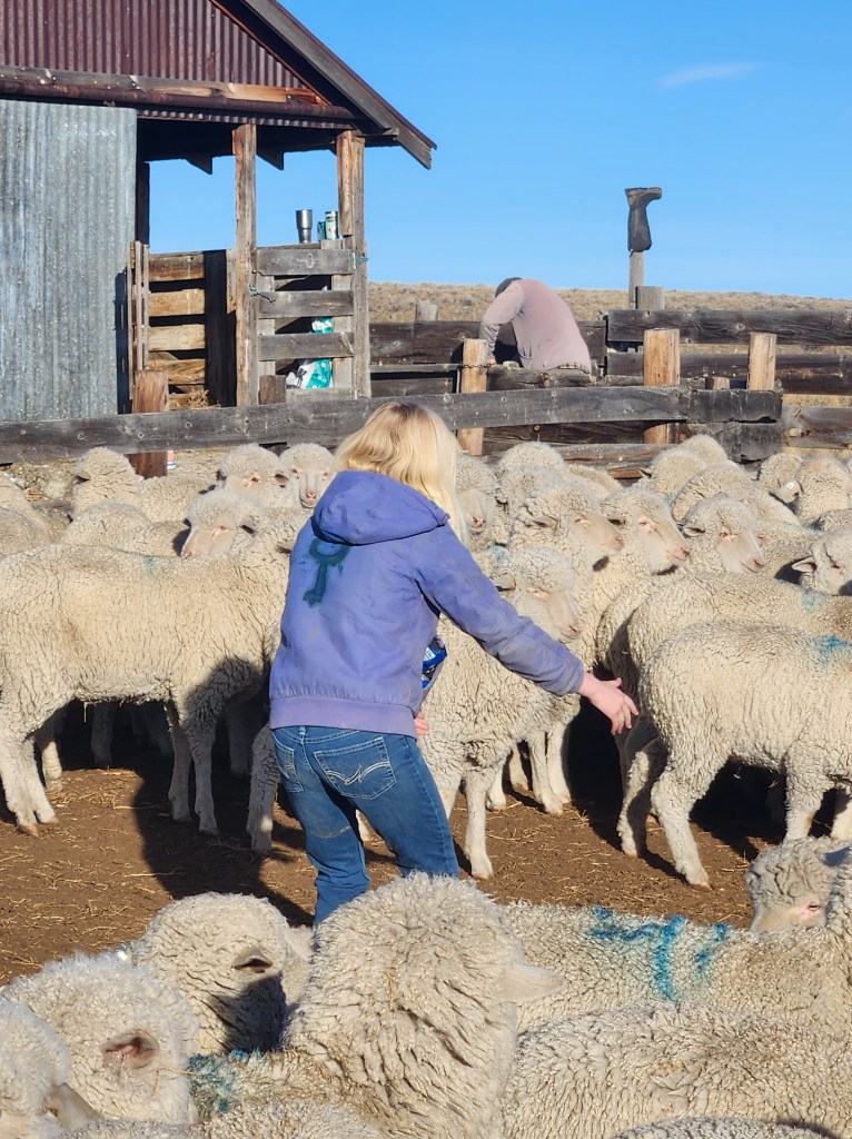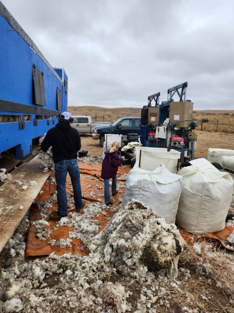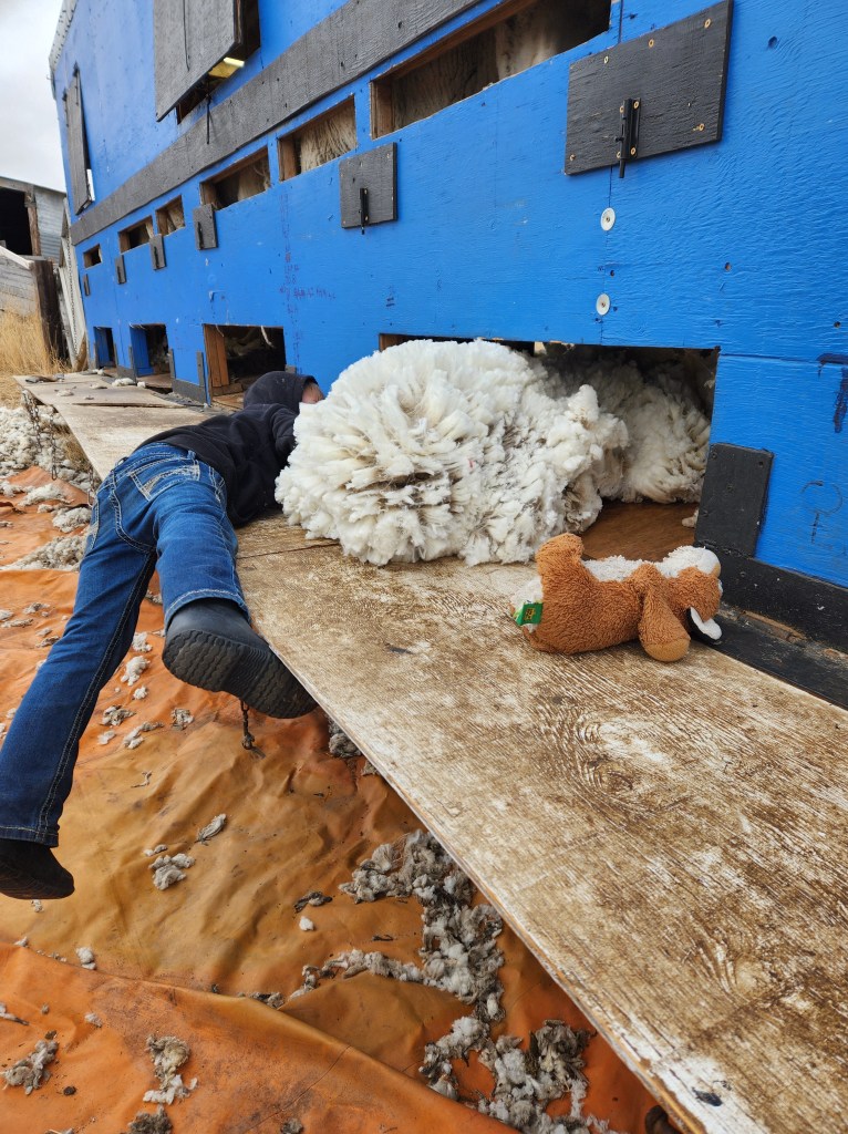 It’s always hard to figure out the balance between ranch education and actual school. The younger two spent the day walking up and down the alley moving sheep and helping to sort wool. My son said, “I love sorting. There’s so much to do. You can grab the bellies, carry the wool, pull the lever [on the packer] and ask that guy questions.” Thank goodness for a patient sorter who seemed to enjoy the company of an 8 and 10-year-old.